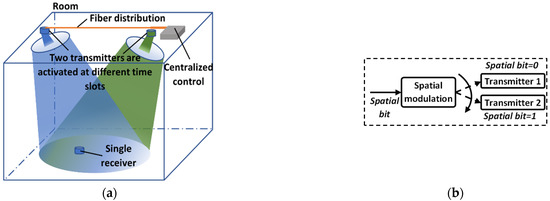 The 2 × 1 MISO OWC system configuration was investigated in this paper to achieve transmitter diversity along with SM in the indoor scenario, as illustrated in Figure 1a. Optical signals from two transmitters (“multiple inputs”) are conveyed over independent OWC channels at different time slots using the SM. Due to the optical beam spread, part of the transmitted optical power is received at a single receiver (“single output”). Beam steering and transmitter activation are centralized-controlled via the fiber distribution network to ensure optical signals from both transmitters can reach the receiver at different time slots.