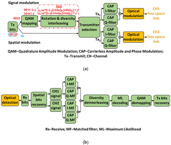 After free-space optical propagation, the optical signals are collected and detected by a single optical receiver. The converted electrical signals are further processed, as shown in Figure 2b. The spatial bits are first recovered, followed by the SSD signals from each transmit channel being routed to their CAP-matched filters, respectively. The two CAP output signals are then summed up for the demodulation of SSD signals, including diversity deinterleaving, maximum likelihood (ML) decoding, and QAM demapping. Finally, the recovered bits from SSD and SM are combined to complete the overall signal recovery.