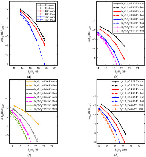 BER of the SSD scheme. (a) With different . (b) With different channel gains and different . (c) With at 45°. (d) With Note: num—numerical, theo—theoretical.