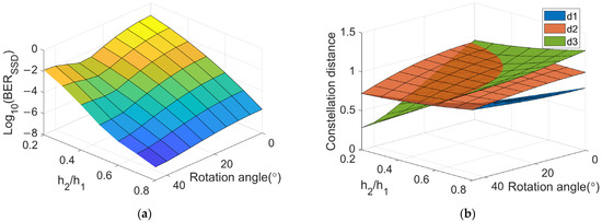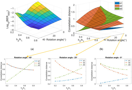 For the second channel gain distribution setting, one of the channel gains is reduced, while the other channel gain is increased to achieve the constant using two consecutive time slots. This setting emulates the scenario when one channel is partially obstructed at one time slot while the other channel compensates for such optical loss at the adjacent time slot. To comprehensively illustrate the BER trend, the signal constellation rotation angle still changes between 0° and 45°. The theoretical BER results are shown in Figure 6a with a high = 18 and 1.5. The corresponding constellation distances of , , and are shown in Figure 6b with insets provided.