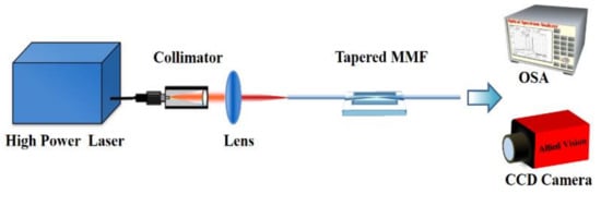 Figure 1 shows the schematic of the experimental setup. Pulse from a high-power laser is coupled into the bi-tapered MMF to observe the beam self-cleaning effect. The initial excitation conditions, such as the input beam size, influence the threshold power of spatial beam self-cleaning [33]. With appropriate initial excitation conditions, the spatial beam self-cleaning could be achieved. Here, we use a collimator and a lens to collimate and focus the beam from the laser on the face of the MMF with bi-tapered structure, adjusting the distance and incident angle carefully to improve the coupling efficiency. At the output of the MMF, a CCD camera (Goldeye, G-033SWIR TEC1) and an optical spectrum analyzer (OSA, Yokogawa, AQ6317C) are employed to record the output beam profile and the spectrum, respectively.