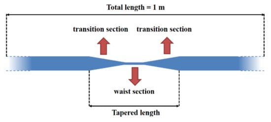 In our experiments, we use standard 62.5/125 μm graded-index (GRIN) MMFs to make the bi-tapered fibers. There are many methods for manufacturing the tapered structure. Considering the actual facilities in our lab, we adopt the flame-heated taper drawing technique. The waist diameter of the bi-tapered MMFs is fixed at about 10 μm. Since we find that the bi-tapered MMFs with waist diameter less than 10 μm could not bear the high-power laser, which always causes damage to the waist section of the bi-tapered MMFs in the experiments. Whereas for the bi-tapered MMFs with a waist diameter larger than 10 μm, the beam self-cleaning is not obvious enough in a short length. Through adjusting the heating time and the drawing force, we can acquire bi-tapered MMFs with different tapered length. The detailed structure of the bi-tapered MMF is shown in Figure 2. During the production, the waist section is always ensured to be the center of the entire fiber. For facilitating the coupling and measurement of the light, the total length of each MMF including the bi-tapered section is as long as 1 m.