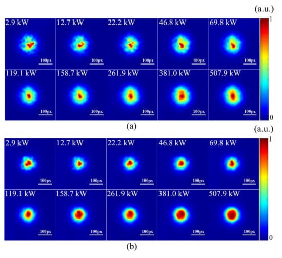 Figure 6. Output beam profiles from the MMFs with tapered length of (a) 1.7 cm and (b) 5.0 cm under different input peak powers (scalebar: 100 pixels).