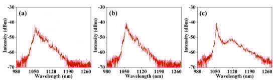 Figure 8. Measured output spectra from MMFs with tapered length of (a) 1.7 cm, (b) 3.6 cm, and (c) 5.0 cm at the input peak power of 507.9 kW.