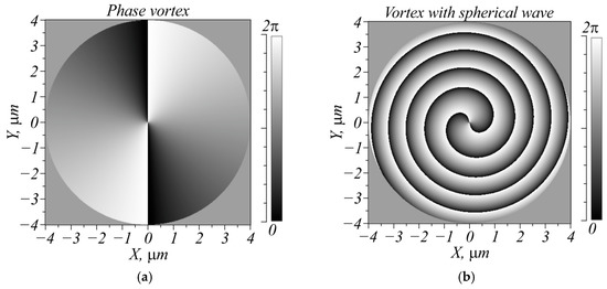 (a) A phase vortex with m = 2 embedded into an incident field and (b) the resulting phase of the initial field containing a spherical wave.