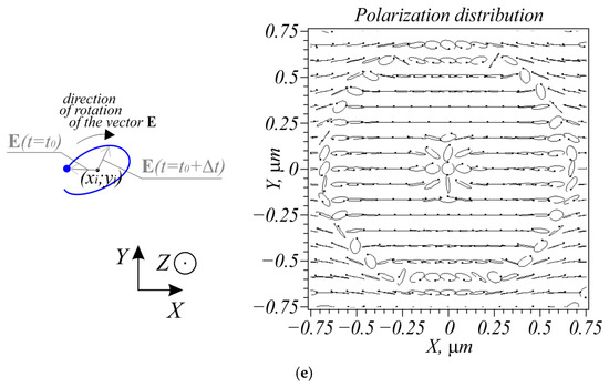 Figure 2 suggests that in the strong focus of a linearly polarized wave, there was a 0.3 µm × 0.27 µm region (on the x- and y-axis, respectively), where the projection of the Poynting vector on the optical axis was negative. From Figure 2e, it can also be seen that in this region a gradual linear-to-circular on-axis polarization conversion occurred, with the E-vector rotating anticlockwise on and near the axis. On the edges of this central region, there were two regions where the E-vector rotated clockwise: X = 0, −0.2 µm < Y < −0.1 µm, and 0.1 µm < Y < 0.2 µm. In addition, in the distribution pattern of the Poynting vector, there was a ring with an approximate radius of 0.66 µm (e.g., 0.622 µm < X < 0.693 µm at Y = 0) in which the Poynting vector projection was also negative (Figure 2d). Within the ring, linear-to-circular polarization conversion also occurred, with the E-vector rotating clockwise as seen from Figure 2e.