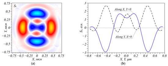Figure 3 depicts a two-dimensional distribution of the SAM vector projection Sz (Equation (5)) alongside its x- and y-axis profiles on the optical axis. The z-axis projection of the SAM vector is seen to be non-zero and positive on the optical axis within the region 0.267 µm < X < 0.267 µm and −0.13 µm < Y < 0.13 µm.