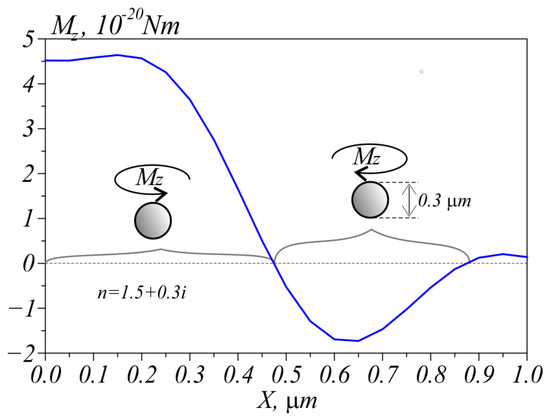 An absorbing microparticle placed in the field depicted in Figure 2 may be expected to experience a torque, making it rotate around its center of mass thanks to circular polarization. Shown in Figure 4 is the result of calculating the projection of a torque Mz exerted on a 0.3 µm microparticle (with refractive index n = 1.5 + 0.3i) relative to the optical z-axis. For a 100 mW incident beam, the numerical simulation was conducted on a λ/30 mesh over the whole field, with a smaller mesh of λ/80 utilized immediately in the microparticle neighborhood on all three coordinate axes in the region −1.5 µm < X < 1.5 µm, −0.65 µm < Y < 0.65 µm, and 0.3 µm < Z < 2.3 µm.