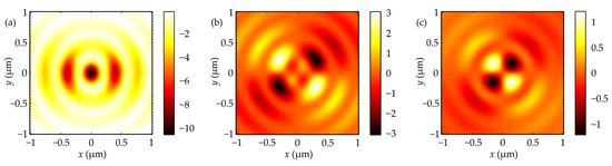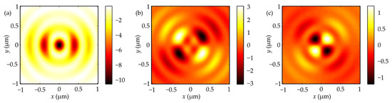 where Im is the imaginary part of the number, E* denotes complex conjugation of the electric field vector, is the vector multiplication sign, and ω is the cyclic frequency of light. In the following, for simplicity, we omitted the constant (1/8πω). Substituting (2) into (5) yields expressions for projections of the SAM vector in the focal plane (z = 0) for an initially linearly polarized optical vortex (m = 2), Equation (1):