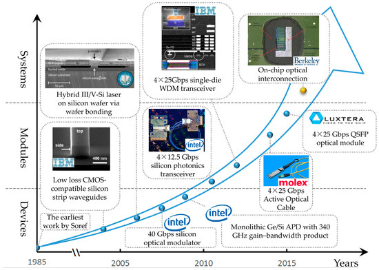 The development trend of silicon-based optoelectronics and some significant works in the past few decades. Figures reproduced from [11,12,13,14,15,16].