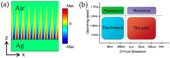 (a) Optical field profile (Ez) of surface plasmons on the air–Ag interface. (b) The operating speed and device sizes of semiconductor electronics, dielectric photonics, and plasmonics. Plasmonics can bridge the gap between nanoelectronics and photonics.