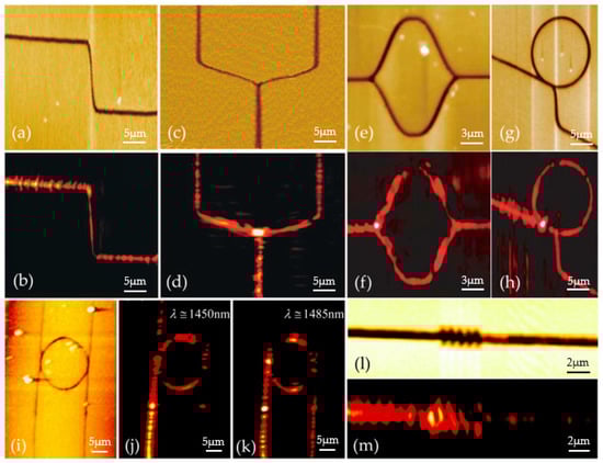 Topographical (a,c,e,g,i,l) and near-field optical (b,d,f,h,j,k,m) images of plasmonic subwavelength waveguide components. (a,b) S-bend [77]. (c,d) Y-splitter [77]. (e,f) Mach–Zehnder (M.Z.) interferometer [78]. (g,h) Waveguide–ring (WR) resonator [78]. (i–k) WR-resonator-based add-drop multiplexer [79]. (l,m) Bragg grating filter (BGF) [79]. Figures reproduced from (a–d) [77]; (e–h) [78]; (i–m) [79].