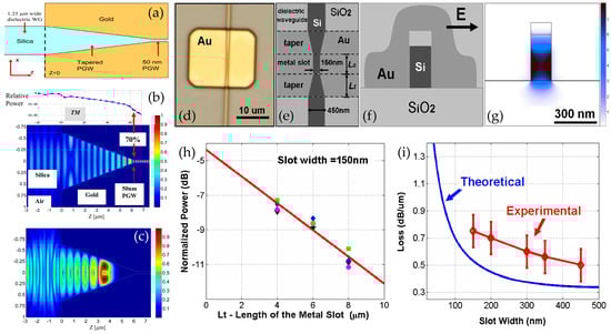 Early works about the seamless transition between silicon photonic waveguides and plasmonic waveguides date back to decades ago. In 2006, Ginzburg et al. [119] theoretically demonstrated a nonadiabatic taper connecting a microscale dielectric waveguide and a nanoscale plasmonic waveguide (shown in Figure 7a). The input is a 1.25 μm-wide silica waveguide with air cladding, and the output is a 50 nm-wide gold slot with silica as the core. A 6 μm-long linear plasmonic gap taper acts as the coupler to realize mode conversion between these two types of waveguides, and a coupling loss of less than 2 dB can be achieved in theory. The field profiles simulated by FDTD are shown in Figure 7b,c. For TM excitation, the light field propagates through the taper with about 70% transmission, while for TE excitation, no plasmon mode can exist. In [120], Chen et al. fabricated metal tapers and slots on silicon-on-insulator wafers by electron-beam lithography patterning, reactive ion etching, metal evaporation, and the liftoff process. The microscope image of the fabricated sample is shown in Figure 7d, and the schematic structure is shown in Figure 7e,f. The silicon waveguide and the metal slot are both 250 nm thick, and the widths are 450 nm and 150–450 nm, respectively. The taper for coupling is about 4 μm long. Results of the experiment are shown in Figure 7h,i. From the linear fit of the normalized power versus the length of the metal slot waveguide (Figure 7h), the coupling and propagation loss for 150 nm wide metal slot can be found to be about 2.5 dB and 0.8 dB/μm, respectively.