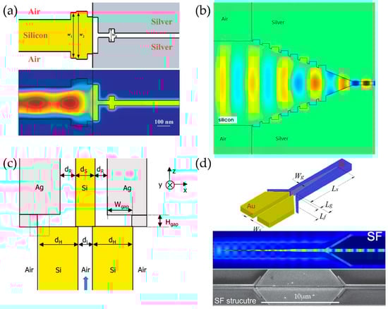 In theory, some more complicated structures can achieve higher coupling efficiencies. For example, Veronis et al. [127] investigated a multisection tapered coupler between a 300 nm-wide Si-slab waveguide and a 50 nm-wide metal–insulator–metal plasmonic waveguides. As shown in Figure 9a, the taper consists of four silicon waveguide sections and four MIM plasmonic waveguide sections. The lengths of the eight waveguide sections are all 50 nm, and the widths of them are optimized by the microgenetic algorithm. With the optimal value of w1 = 420 nm, w2 = 440 nm, w3 = 440 nm, w4 = 340 nm, w5 = 330 nm, w6 = 40 nm, w7 = 40 nm, w8 = 120 nm, the multisection taper reaches a coupling efficiency of 93%. Similarly, a partially corrugated taper [143] (shown in Figure 9b) was demonstrated by Y. Liu. et al. The dispersion relationship of corrugated waveguides can be engineered to extend across the light line [147,148]. In the coupler design, they utilized this principle to convert the silicon-waveguide-guided mode across the light line to match the plasmonic gap waveguide mode. As a result, a coupling efficiency of 93% was also realized between a 1.25 μm-wide Si-slab waveguide and a 50 nm-wide plasmonic gap waveguide. Figure 9c illustrates a coupler structure for silicon slot waveguides and hybrid plasmonic waveguides. The coupling region consists of a small air gap with a length of Hgap = 50 nm. Compared with direct coupling, the insertion of the intermediate section improves the coupling efficiency from 75% to 90%. By taking more parameters into account, these more complicated taper structures can be designed to significantly reduce the coupling loss. However, the complexity of structures can be challenging in fabrication. In [132], a slot–funnel (SF) structure (shown in Figure 9d) for mode conversion was designed and fabricated. An additional silicon strip–slot mode converter was added before the conventional taper structure. According to the slot–slot coupling scheme, the mode and effective refractive index matching are improved, and only a small loss due to the gaps between silicon and metal is introduced. In the experiment, the coupling loss of the slot–funnel mode converter was measured to be 4 dB, which is above expectations and can be attributed to the fabrication roughness and misalignment.