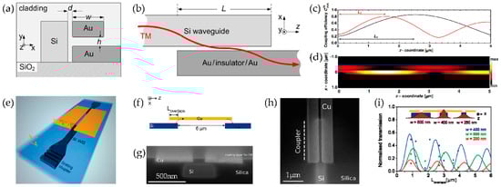 Compared with the single interface metal, the directional coupling into metal–insulator–metal multilayer plasmonic waveguides usually have better light confinement and lower coupling loss. Figure 11 shows two reported directional couplers between silicon waveguides and MIM plasmonic waveguides with horizontal and vertical space, respectively. Figure 11a,b is the cross-section and top views of a horizontally spaced directional coupler [150]. For overlapping with the evanescent fields in the silicon waveguide, the MIM plasmonic waveguide should also be a horizontally oriented one in the horizontally spaced directional coupler (as shown in Figure 11a). According to the coupled-mode theory, the TM mode couples between the silicon and plasmonic waveguides and oscillates as a function of the length. The characterization of directional coupling is illustrated in Figure 11c, in which the different coupling lengths L1 and L2 correspond to two different distances of 20 nm and 60 nm between the silicon and plasmonic waveguides. The electric field distribution is shown in Figure 11d, which also reveals the nature of field oscillating in directional coupling. In [151], Delacour et al. designed and fabricated a directional coupler with the silicon and plasmonic waveguides vertically spaced (shown in Figure 11e–i), of which the principle is the same as the previous one in [150]. In the experiment, they measured at least 70% coupling efficiency around the wavelength of 1550 nm from a 400 nm × 220 nm silicon strip waveguide to a 25 nm × 50 nm silver slot waveguide with a metal–silicon gap of 30 nm and coupling length of 0.9 μm.