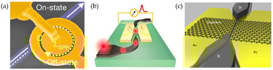 Silicon-based hybrid plasmonic devices and circuits have attracted the interest of researchers for some time. This is due to the unique characteristics of plasmonics that can realize stronger light confinement and improve the performance and integration of silicon-based optoelectronics. Figure 13 shows some recent representative works of silicon-based hybrid plasmonics that also concern the coupling designs of plasmonic waveguides. In 2018, an outcome of a plasmonic electro-optic modulator was reported by Haffner et al. [91]. As shown in Figure 13a, the plasmonic ring resonator couples to the silicon waveguide by directional coupling methods with a coupling loss of about 1 dB. In the off state, light is coupled to the plasmonic ring resonator. While in the on state, the plasmonic ring is out of resonance to prevent coupling loss. The fabricated compact plasmonic electro-optic ring modulator can be operated at over 100 GHz with great energy efficiency. This result reveals the potential of silicon-based hybrid plasmonics to realize fast and compact communications technologies. Similarly, Ding et al. and Ono et al. demonstrated a graphene plasmonic photodetector (Figure 13b) and switch (Figure 13c), respectively, in 2020. These structures use tapered couplers to connect to silicon waveguides. Taking advantage of higher carrier mobility, unique electronic band structure, and ultra-broadband nonlinear absorption, these graphene-based devices realize ultra-compact footprints, high speed, and efficient energy consumption at the same time.