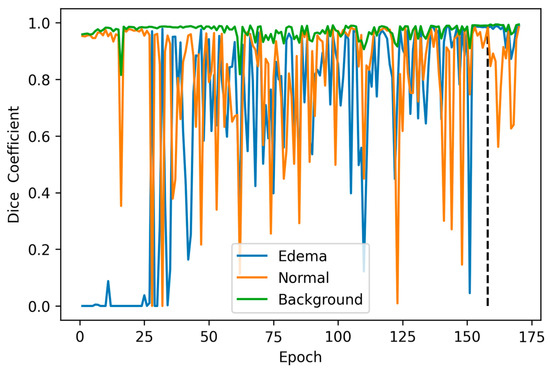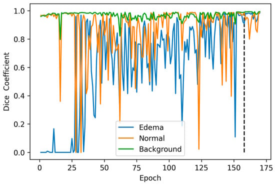 Epi Edema Detector was trained for 158 epochs. The final Dice coefficients for the “Edema”, “Normal” and “Background” classes were, respectively, 0.908, 0.989 and 0.989 in the training set and 0.982, 0.985 and 0.990 in the test set.