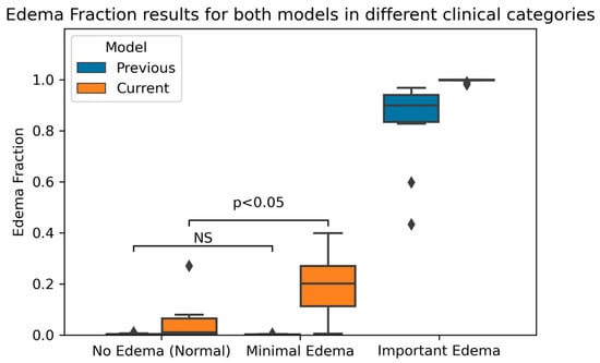 Boxplot of edema fraction for each group and each model. NS: not significant.