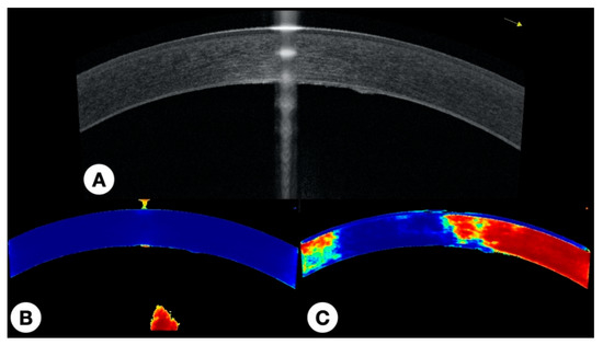 Example of an OCT image (A) from a patient with a DCCT of 71 µm. Corresponding colored heat map of the output probabilities of edema of our previous model (B) and of our current pipeline (C). Hotter colors indicate higher probabilities of edema. OCT: optical coherence tomography; DCCT: differential central corneal thickness.