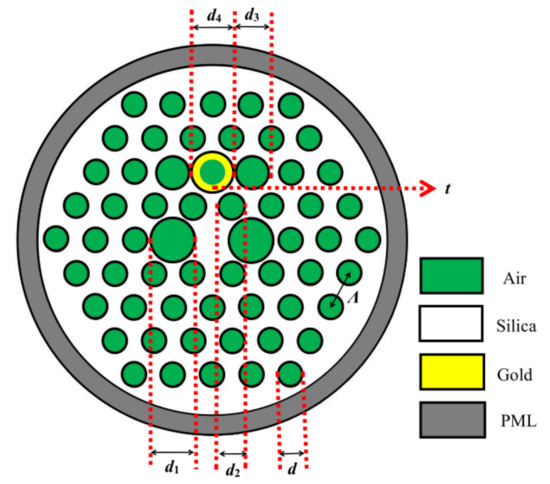 The cladding structure of the presented PCF polarization filter arranged in hexagonal pattern contains four layers air holes as shown in Figure 1. To obtain the much higher birefringence, the asymmetric factor is introduced in the proposed design. It is due to that, that higher birefringence can effectively separate the resonance point of two polarized CM with SPM. A larger loss difference between the Y and X-polarized CM can be achieved for a strong asymmetric PCF structure, which is a benefit for the single polarization filtering. Two large air holes with d1 are distributed on both sides of the core. The respective structural values of the outer diameter and the thickness of the gold-coated holes are denoted as d4 and t. The two air holes with d2 lie between the fiber core and the gold film hole. The two large air holes with d3 are distributed on both sides of the gold film hole. The spacing between neighboring air holes is Ʌ = 2 μm. The remaining air holes are identical with d = 1.20 μm.