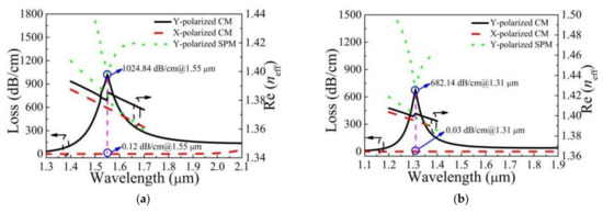 The optimal parameters d1 = 2.40 μm, d2 = 1.38 μm, d3 = 1.80 μm, d4 = 2.20 μm, t = 25.60 nm and t = 55.30 nm are obtained during a time consuming process. Figure 2 shows the loss and Re(neff) of CM and SPM with two different t in the left and right arises, respectively. From Figure 2a, when t is 25.60 nm, the Re(neff) of Y-polarized CM has intersection with that of Y-polarized SPM at 1550 nm, where SPR effect happened due to the phase-matching between them. Furthermore, in the Y-polarized direction, CM and SPM have the same loss, which indicates that complete coupling has occurred [26]. However, the coupling strength of both X-polarized CM and SPM is very low, and the loss spectrum appears flat. The respective losses of both Y and X-polarized CM are 1024.84 and 0.12 dB/cm around 1550 nm with a large loss ratio of 8540.33 in both polarizations. Figure 2b shows that the Re(neff) of Y-polarized CM has intersection with that of Y-polarized SPM at 1310 nm as t is 55.30 nm. Besides, Y-polarized CM has the resonance peak with maximum loss, when a complete coupling between CM and SPM occurs. Similarly, in the X-polarized direction, the coupling is weak and no loss peak appears. The losses of 682.14 and 0.03 dB/cm for the respective Y and X-polarized CMs are achieved at 1310 nm, and the loss ratio is 22,738.