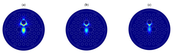 In order to better illustrate the effectiveness of the exhibited structure in increasing loss ratio of the two orthogonal polarization directions, the loss and distribution of the electric field of CM with different values of d3 are analyzed. Figure 3 and Figure 4 show the corresponding distribution of the electric field of Y-polarized CM and the losses of two polarized CM with d3 = 1.40, 1.60, 1.80 μm and d1 = 2.40 μm, d2 = 1.38 μm, d4 = 2.20 μm, t = 25.60 nm. The loss peak wavelength is 1740, 1600 and 1550 nm, respectively. From Figure 3 and Figure 4, as the value of d3 increases, the distance between the gold film hole and the two air holes with d3 decreases, the designed structure can effectively prevent the diffusion of the electromagnetic field intensity from the core to the metal surface, and the energy is concentrated in a certain area of the metal surface. Additionally, the mode coupling method has also changed, that is, the CM is no longer coupled with the second-order SPM, but it is only coupled with a part of the second-order SPM. The energy does not spread to other regions. Therefore, the coupling strength in the Y-polarized direction will be stronger. On the other hand, it effectively blocks the coupling channel between the CM and SPM in the X-polarized direction. Therefore, the intensity of the X-polarized loss decreases as d3 increases. This results in the loss difference and loss ratio of the designed PCF polarization filter being very large.