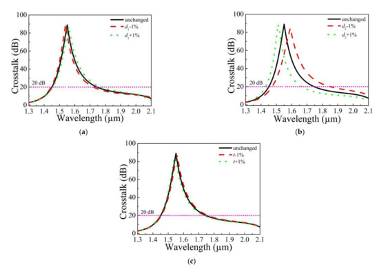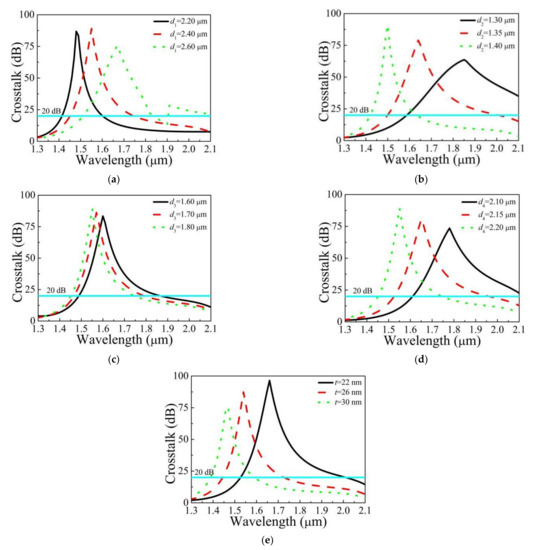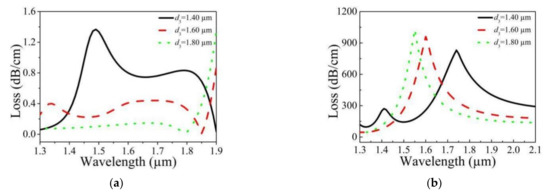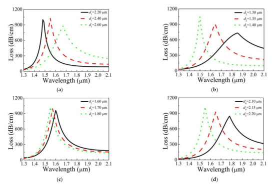 In the following section, the analysis results in Figure 6 show that the polarization filter characteristics vary with different d1, d2, d3, d4, and t values. As shown from Figure 6a, the peak wavelength experiences a red shift by increasing d1 from 2.20, 2.40 to 2.60 μm. It should also be noted that the peak intensity of Y-polarized CM increases firstly and then decreases as d1 increases. This is because the further increase of d1 results in the light constrained weakly in the core, which makes the coupling between them weak and the peak intensity reduce. Hence, the peak wavelength and intensity of the loss can be coarsely adjusted by selecting appropriate d1. Figure 6b shows the loss of Y-polarized CM varied with d2 = 1.30, 1.35 and 1.40 μm. From Figure 6b, the peak wavelength decreases from 1850 to 1500 nm by increasing d2 values from 1.30 to 1.40 μm. Furthermore, the peak intensity of Y-polarized CM increases obviously with increasing d2. Therefore, the peak wavelength and intensity can be coarsely tuned with selecting proper d2. Figure 6c shows the loss of Y-polarized CM varied with d3 = 1.60, 1.70 and 1.80 μm. From Figure 6c, the peak wavelength is 1600, 1570 and 1550 nm when d3 is 1.60, 1.70 and 1.80 μm, respectively. Moreover, the peak intensity of Y-polarized CM increases slightly as d3 increases. It can be seen from the above analysis that the peak wavelength and intensity of the loss do not obviously change with the increase of d3. Therefore, the peak wavelength and intensity can be fine-tuned by adjusting d3 appropriately. Figure 6d shows the loss of Y-polarized CM varied with d4 = 2.10, 2.15 and 2.20 μm. From Figure 6d, the peak wavelength of Y-polarized CM shifts to shorter wavelength, that is, from 1780 to 1550 nm with d4 increasing from 2.10 to 2.20 μm. Meanwhile, the peak intensity of Y-polarized CM increases from 846.74 to 1024.84 dB/cm with the increase of d4. Therefore, the peak wavelength and intensity can be coarse adjusted by using the appropriate d4. Figure 6e shows the loss of Y-polarized CM varied with t = 22, 26 and 30 nm. From Figure 6e, the peak wavelength of CM shifts to shorter wavelength with the increase of t, but the movement speed slows down gradually. This is because the Re(neff) of SPM decreases with increasing t, but that of CM does not alter distinctly, which generates the blue-shift of the phase-matching point. Furthermore, the increasing t value decreases the peak intensity of Y-polarized CM. That is why the light has difficulty penetrating it as the gold film is too thick, which makes the coupling between CM and SPM weaken. Therefore, the peak wavelength and intensity of the loss can be roughly adjusted by tuning t properly.