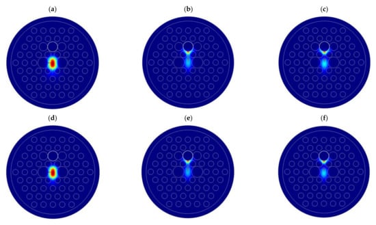 Figure 5 shows the distribution of the electric field of X-polarized CM, Y-polarized CM, and Y-polarized SPM at 1550 and 1310 nm with the complete coupling between Y-polarized CM and SPM. From Figure 5, whether at 1310 nm or 1550 nm, the distributions of these three kinds of modes are similar. The electromagnetic field intensity of X-polarized CM is confined to the PCF core, while that of Y-polarized CM is transferred to the SPM. Moreover, the electric field distributions of both Y-polarized CM and SPM are essentially the same. That indicates when the light with the wavelength of 1550 nm or 1310 nm is transmitted for a certain distance, the light intensity distribution in Y-polarized direction is attenuated seriously, but the X-polarized light still retains a high energy. Therefore, the single polarization filter is realized.