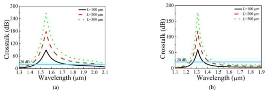 Figure 7 shows the CT value varied with L = 100, 200, and 300 μm as the PCF is arranged with the optimal structural parameters. From Figure 7, it is clear that the CT value reaches to the peak both at 1550 and 1310 nm. As L is increased from 100 to 300 μm, whether at 1550 nm or 1310 nm, both the peak of the CT value and the bandwidth with a CT value greater than 20 dB are increased. The available bandwidth is 280 nm, and the maximum CT value is 89.01 dB at 1550 nm when L is 100 μm in Figure 7a. The CT value is greater than 20 dB in all bands as L is more than 300 μm. From Figure 7b, as L is 100 μm, the available bandwidth is 90 nm, and the maximum CT value is 59.24 dB around 1310 nm. In contrast to the previously reported filter, the presented filter with shorter lengths reveals higher CT value and wider bandwidth. The results show that the designed polarization filter can achieve a strong filtering performance both at the communication wavelength of 1550 and 1310 nm.