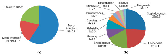 The amount of sterile and contaminated calculi by mono and mixed pathogens as well as various strains was expressed as percentages ± standard error of the proportion. The fluorescence intensity was presented as mean ± standard deviation. The reduction of colony forming units of each strain was calculated in percentages of the control and shown as a mean ± standard deviation. To calculate the statistical significance of the differences, the ANOVA with Bonferroni post-hoc test was used. Statistical analysis was performed with Statistica 10 (StatSoft. Inc., Tusla, OK, USA). p-values ≤ 0.05 were considered statistically significant.