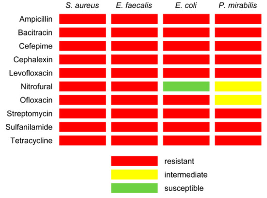 Staphylococcus aureus and Enterococcus faecalis strains were shown to be resistant to all the tested drugs (MAR = 1). It was found that Escherichia coli was susceptible to nitrofural (MAR = 0.9) and Proteus mirabilis had intermediate sensitivity to ofloxacin and nitrofural (MAR = 0.8). High sensitivity was not found to any of the drugs.