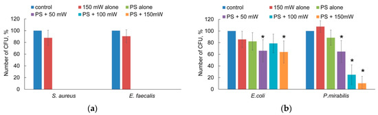 The output laser power in the study was chosen so as to achieve the bactericidal effect. The fraction of viable bacteria for the photodynamic inactivation experiments was expressed as the percent of CFUs out of the strains treated with both light and photosensitizer. As a control, CFUs measured for strains were treated with neither photosensitizer nor light. Therefore, the viable fraction corresponding to PS is a measure of the toxicity of the photosensitizer and ambient light to the bacteria. The bar graphs of bacteria viability are shown in Figure 6. The toxicity of Fotoditazin alone had a strong effect on Gram-positive strains (Figure 6a). After 15 min of incubation in the dark followed by 15 min of manipulation (dilution, inoculation) at ambient light, no colony was detected on the plates. There was no difference in killing between S. aureus and E. faecalis. In contrast to the photosensitizer, the treatment of either Gram-positive or Gram-negative bacteria by laser light only did not induce significant reduction of CFUs. The survival rate of P. mirabilis for photodynamic inactivation was power-dependent. The number of viable bacteria decreased from 65% to 10% with an increase in power from 50 mW to 150 mW. The maximal bactericidal effect was reached at 150 mW (Figure 6b).