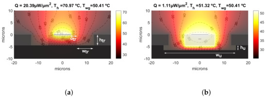 In order to investigate the influence of the various dimensions on the TO shifter’s performance, these were parametrized, as illustrated in Figure 2: the trench width (), the separation distance from the end of the heater to the start of the trench (), the height of the trench (), and the width and height for the undercut ( and , respectively). The temperature distributions, under the same phase shift conditions previously described, for both geometries, and a fixed set of the previously listed parameters, are shown in Figure 2. As expected, the design including trenches and undercut exhibits a much better thermal isolation, where the heat flux is minimized, and thus the heater temperature. Next, the multi-parametric runs for the different dimensions of both cross-sections were performed. At every iteration, a new shifter geometry was created considering a new dimensional value of the trench or the undercut, always keeping the same heater and layer properties.