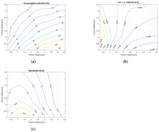 Performance contour plots varying the trench height () and offset () at phase shift for a heater and trench width () of 7 m: consumption reduction (a), crosstalk phase shift (b), and bandwidth (c).