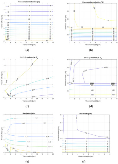 Simulation results for the TO phase shifter with trenches (left column): consumption reduction (a), crosstalk phase shift (c) and bandwidth (e), with = 1 mm, = 7 m, = 0.1 m. Simulation results for the phase shifter with trenches and undercut, right column (b,d,f), with = 4.8 m, = 2.5 m, = 7 m. Both columns are results for the same heater dimensions.