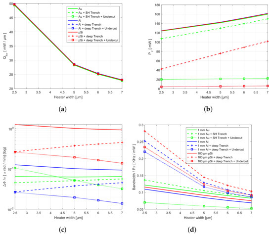 Last but not least, we introduce a new FoM which to our understanding is relevant, the bandwidth available per unit power to shift , BW/. From the previous discussions, we found that isolation of the TO shifter area results into increased power efficiency, at the cost of BW. Hence, the proposed ratio represents a balance of both. The results for the different technologies analyzed are plotted in Figure 5d. For each heater line material, the best ratio is obtained for trenched TO shifters. For example, the poly-Si trenched heater of width m has a ratio of approximately 0.145 kHz/mW, and = 75 mW (BW = 10.875 kHz). The same, with undercuts shows 0.125 kHz/mW, that yields BW = 0.625 kHz ( = 5 mW).