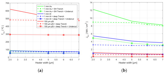 Hence, we next give some insight into the factors that degrade heaters reliability and durability, temperature, and current density. In Figure 6a we present the heater line temperature required for an optical phase shift of , termed . Although the 1 mm heaters have in the range of 71 to 85 °C, the 100 m length poly-Si heater reaches temperatures as high as 620 °C for the 2.5 m width fully-clad design down to 482 and 294 °C for the trenched design and undercut one, respectively. These, in turn, are extremely high temperatures used in, e.g., ignition applications in solid propellant microthrusters [43]. Complementarily, we show in Figure 6b the corresponding required current density . The values are quite differentiated depending on the heater material due to the dissimilar resistance obtained. The values for the poly-Si, which is the most resistive are 1, 0.6, and 0.16 MA/cm for the fully-clad, trenched, and undercut configurations, respectively. These values are well below the reverse annealing point (1.5 MA/cm), transition point (3 MA/cm) and breakdown point (6 MA/cm) reported in [44] for a similar poly-Si resistor. Note, however, these limits depend on structural properties of the material (grain size), that are particular to each fabrication process. In the presented designs, the 100 m heater is an extreme case requiring high , but from the material durability point of view this seems feasible. On the contrary, while the is modest for the Au and Al based heaters, the associated current density for an optical shift of is above the mentioned limits, and thus electro-migration could take place. On the other hand, some applications may not require reaching a phase change, and, therefore, the required temperature and associated current density are lower.