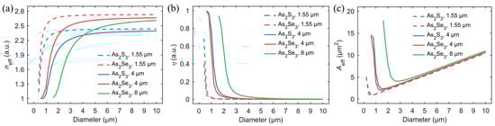 Numerical solutions of diameter-dependent (a) effective refractive index (neff), (b) fractional evanescent fields (η), and (c) effective mode area (Aeff) of As2S3 and As2Se3 MFs at wavelengths of 1.55 μm, 4 μm, and 8 μm, respectively.