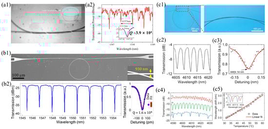 ChG MF-based resonators. (a1) Optical micrograph of the intertwisted overlap region of a SU8 polymer-embedded As2S3 MKR. (a2) Transmission spectrum of the MKR. Reprinted with the permission from [38] © The Optical Society. (b1) SEM image of a 178.2-μm diameter As2Se3 MLR. The inset shows the self-coupling region. (b2) Transmission spectrum of the MLR. Inset: Lorentzian fitting to a resonance mode at 1552.9 nm. Reprinted with the permission from [37] © The Optical Society. (c1) Optical micrograph of an 824-μm diameter As2S3 MKR. Inset: optical micrograph of the intertwisted overlap area. (c2) Transmission spectrum of the MKR. (c3) Lorentzian fitting to a resonance mode centered at 4469.14-nm wavelength. (c4) Transmission spectra of an As2S3 MKR by tightening the knot structure in liquid (from top to bottom). (c5) Resonance shift of an MKR with the temperature rising from 31.4 °C to 59.8 °C. Inset: transmission spectra of resonance modes corresponding to 31.4 °C (blue line) and 40.6 °C (red line). Reprinted with the permission from [45] © CLP Publishing.