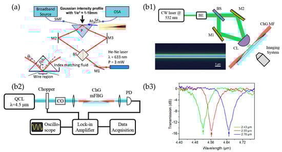 Mid-IR MF gratings. (a) Experimental setup for the As2Se3 MF Bragg grating photo inscription assisted by prism and in-situ monitoring of the process. Reprinted with the permission from [40] © The Optical Society. (b1) Schematic illustration of the As2S3 mFBG fabrication setup using interference pattern formed by two 532 nm beams. Inset: optical micrograph of a 2.4-μm diameter ChG mFBG. (b2) Schematic illustration of the optical characterization of ChG mid-IR mFBGs. (b3) Transmission spectra of mFBGs with different MF diameters. Reprinted with the permission from [46] © The Optical Society.