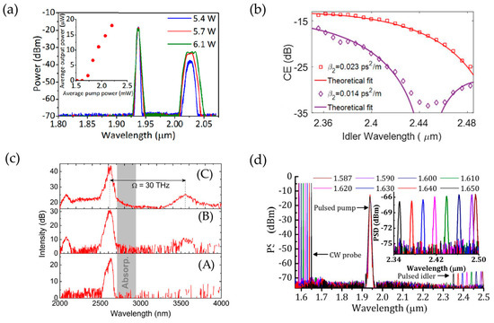Besides the large nonlinear optical coefficient and broad mid-IR transparency, ChGs are excellent candidates for mid-IR frequency conversion (e.g., optical parametric oscillation (OPO) and optical parametric amplification (OPA)) for their high laser damage threshold and moderate birefringence [100]. The efficiency of frequency conversion depends on phase matching, nonlinear gain and losses. The tapering of ChG fibers to increase nonlinearity while compensating the normal material dispersion has been demonstrated. In 2016, Abdukerim et al. reported the first fiber optical parametric oscillator (FOPO) using an As2Se3-COP MF at 2 μm based on four-wave mixing (FWM) [101]. The MF with a core diameter of 1.47 μm led to a waveguide nonlinearity of 24 W−1m−1 and a zero-dispersion wavelength of 1.875 μm. The FOPO had a pump threshold power of 5 W and covered a tunable wavelength range of 290 nm. In the FWM process, where pump and idler are far-detuned, the exact phase-matching wavelength is highly sensitive to chromatic dispersion and hard to control. In 2019, Alamgir et al. demonstrated the far-detuned wavelength converter by in-situ monitoring the output wavelength while tapering down the As2Se3 fiber [97]. As the tapering proceeded, the phase-matching condition was satisfied closer to the pump wavelength and the gain spectrum gradually shifted towards shorter wavelengths. The idlers were generated with a spectral range of 2.347–2.481 μm from a pump wavelength of 1.938 μm (Figure 6b).