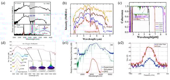 Tapering the fiber is also an important method to obtain a highly coherent SC by designing an all-normal dispersion of fibers to suppress soliton effects including soliton fission and Raman soliton self-frequency shift. In 2019, Li et al. reported a 1.5–8.3 μm SC generation with a high coherence property from As-S tapered MF pumped at 3.75 μm (Figure 7c) [104]. They found that the coherence properties gradually become worse when the waist core diameters of tapered MFs decrease and a flat and near-zero dispersion is beneficial for high-coherence SC generation.