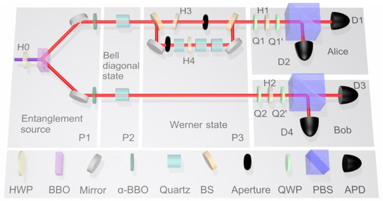 In our experiment, and are represented by the horizontal and vertical polarization of a photon, respectively. The experimental setup can be divided into two modules: the state preparation and the measurement module (Figure 2). In the state preparation module, the entangled photon pairs are generated via a type-I spontaneous parametric down-conversion process [33,34] of the pump beam from a semiconductor laser with 400.8 nm on the first platform, P1. The pump beam’s polarization is controlled by a half-wave plate (HWP) , passed through a pair of back-to-back nonlinear -barium-borate (BBO) crystals with two optical axes vertical to each other. By setting the angle of as 22.5°, photon pairs are prepared into . The following couple of -BBO crystals after two mirrors are used to modulate the phase difference between two photon paths. On the basis of P1, the second platform P2 is added to prepare arbitrary Bell diagonal states . Here, we use a couple of quartz crystals of the same length to realize the decoherence parameter p. The optical axis of one quartz crystal is horizontal, and the other is vertical. Different Bell diagonal states are prepared by adjusting the length of quartz crystals. For Werner states, we replace P2 by platform P3. Inspired by Ref. [35], we use the beam splitters (BSs), quartz crystals, and apertures to introduce the decoherence. In the upper path, the photons first go across a 50/50 BS and separate into two ways. The HWP in the transmission way is tilted to compensate the phase of the two-photon states for the generation of . The reflected way has a set of quartz crystals with a sufficient thickness and an HWP with 22.5° to dephase the state into a completely mixed state. The two adjustable apertures in the reflected and transmission ways are used to change the ratio of two states mixed at the output port of the second BS for the generation of an arbitrary Werner state . The optical path difference between the two ways is large enough to lead to incoherent superposition since there is a lack of compensated crystals in a transmission way. In the lower path, the photons directly propagate to the measurement setup.