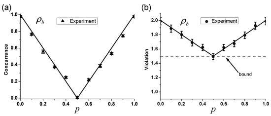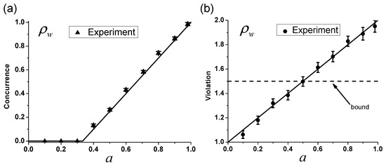 For each measurement, we record the clicks for 20 s under a 7 ns time window, and the total coincidence counts are approximately 10,000. The fidelities of Werner states in the experiment are all higher than 0.982, and we show the concurrence with a different decoherence coefficient a, as calculated by the density matrices of the states which are reconstructed through quantum state tomography. In Figure 3a, we show that the experimental values agree well with theoretical concurrence, which tells us the states are entangled when . We then calculate the violation of Equation (5), according to the experimental raw data of conditional probabilities . Figure 3b shows the measurement violation as a linear function of decoherence coefficient a and the experimental values match well with the theoretical ones. At the point , the sum of correlation is , which indicates that the Werner state is steerable when .
