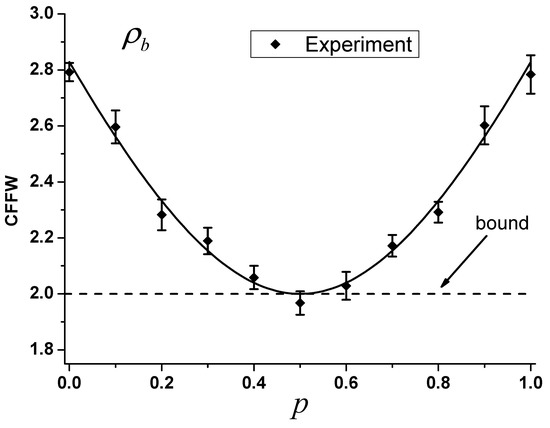 For Bell diagonal states, we also use the sandwich type QWP-HWP-QWP sequence and a PBS to implement the measurement operators. Unlike the Werner state, the setting angles of wave plates change with parameter p. Table 1 gives the whole setting angles of the QWP-HWP-QWP sequence to realize the measurement operators which maximally violate the CFFW inequality of different Bell diagonal states. Figure 6 exhibits the experimental violation data of the CFFW inequality. We conclude that the values are symmetrical about the . When , the point data is , which indicates that the state is unsteerable.