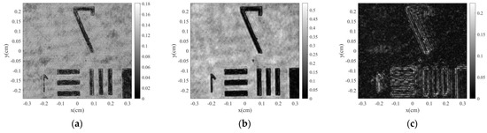 To compare the results of the IDFDHM dark-field experiments with the results obtained using other techniques, a control set experiment was conducted. The dark-field object light images that were obtained through spatial filtering in this study are shown in Figure 3b. The CCD was used to record the object light and the reference light separately, and the hologram was recorded after the interference between the reference light and the object light. The reconstructed image of the control set is shown in Figure 4c. Although Figure 4c,b show the same resolution (3.91 μm), the control set configuration exhibits the disadvantages of traditional dark-field microscopy, such as signal loss and an unfiltered background. As observed in Figure 4b, the image that was reconstructed by the IDFDHM method has clear edge contours and retains intact object information. A review of the literature shows that high-contrast images have high standard deviations [19,20]. Therefore, standard deviation values were used to analyze the image quality. The reconstructed image was a grayscale image, as shown in Figure 4. By calculating the standard deviation of each pixel intensity (gray level), this analytical method provided the degree of grayscale intensity distribution in the image. The standard deviations of Figure 4a–c are 40.8, 49.3, and 34.3, respectively. A comparison between the standard deviation of the IDFDHM of the dark-field state and the control set configuration reveals that the standard deviation increased by 43%.