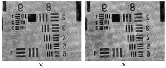 Thereafter, an IDFDHM experiment was conducted in the dark field. The CCD was used to record the object light and the reference light separately; thereafter, the two light waves interfered with each other to record the hologram. Subsequently, the interference state was modulated by destructive interference. Next, a dark-field hologram was recorded. The reconstructed image of IDFDHM in the dark field is shown in Figure 4b. As shown in the Figure, the image is sufficiently clear to identify the line pairs in group 7, element 1 on the resolution target, where the line pair density is 128 line pairs/mm.