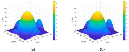 After determining the resolution of the system, other samples were used for testing. A commercial microlens array from SUSS MicroOptics (refractive index, n = 1.457; pitch = 100 μm) was used as the sample. Figure 6a,b show the reconstructed 3D information of a microlens array in the bright-field and dark-field IDFDHM, respectively. The specifications (provided by the manufacturer) of the lens sag and lens width of the microlens array are 9.8 μm and 95.0 μm, respectively. The experimental results indicate that the lens sag and lens width of the microlens array are 9.3 and 94.2 μm, respectively, as shown in Figure 6a. The reconstruction result in the dark field indicates that the lens sag and lens width are 9.4 and 94.8 μm, respectively. The results in the dark field were closer to the manufacturer’s specifications than the results in the bright field.