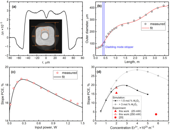 It is worth noting that the PCE of the T-EDF described in [20,21,22] was only 3–4% at an erbium ion concentration of 6∙1025 m−3. Considering that it had an Al2O3-P2O5-SiO2 glass matrix and taking into account the result of [8], it can be assumed that its PCE would be comparable to that of the T-EDF with an Al2O3-F-SiO2 glass matrix. In addition, from our previous study [27], one would expect it to be between the curves for high and low alumina doped matrices. Therefore, the low PCE for T-EDF in [20,21,22] is likely due to some overlooked fact. For example, the pump NA can be significantly different from what was assumed due to the angled thick end facet. Nevertheless, the realization of the same or higher erbium concentration in the core of the T-EDF is inadvisable due to already obtained low PCE. According to the simulation results, the selected erbium ion concentration is in the optimal range of (2–3)∙1025 m−3, resulting in peak cladding small-signal absorption of 1.8 dB/m at 976 nm. Higher concentration results in higher clustering and decreases efficiency. At a lower concentration of erbium ions, the pump absorption from the cladding becomes smaller and decreases the PCE. In addition, a larger amount of unabsorbed pump power can cause damage to the T-EDF at the leakage point [25]. Thus, the chosen Er concentration in the fabricated T-EDF seems to be a little lower than the optimal one.