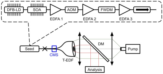 We measured the PCE of the T-EDF in a counter-pumped scheme, where the CW signal was launched into the thin end of the fiber and the pump was coupled by a pair of lenses into the thick end facet of the T-EDF. The end facet was polished at an angle of 7° to prevent Fresnel reflection. The dichroic mirror was used to separate the pump and signal. The setup scheme is presented in the lower part of Figure 2 (the seed is replaced by a CW source emitting at 1560 nm). The measurement of the slope PCE dependence on the input signal power is presented in Figure 1c. The maximal slope PCE was 18.7% for the input power of 0.25 W.